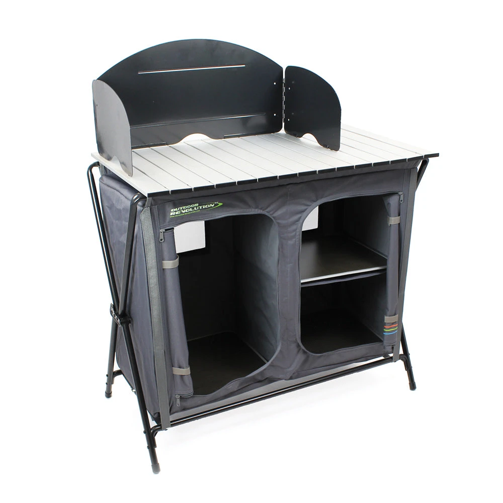 The Outdoor Revolution camping kitchen is super quick and easy to assemble only taking a couple of minutes to do so, and look slick and stylish in any tent or awning.