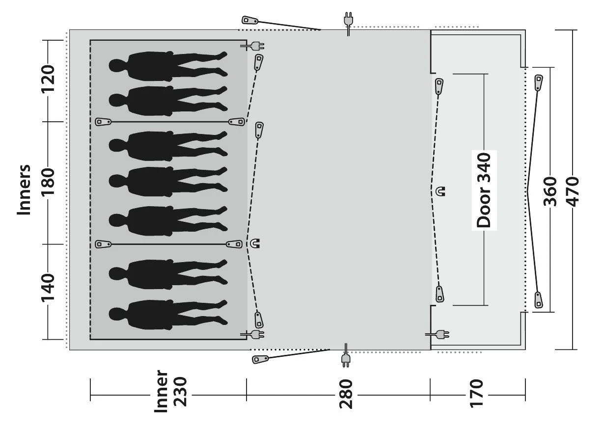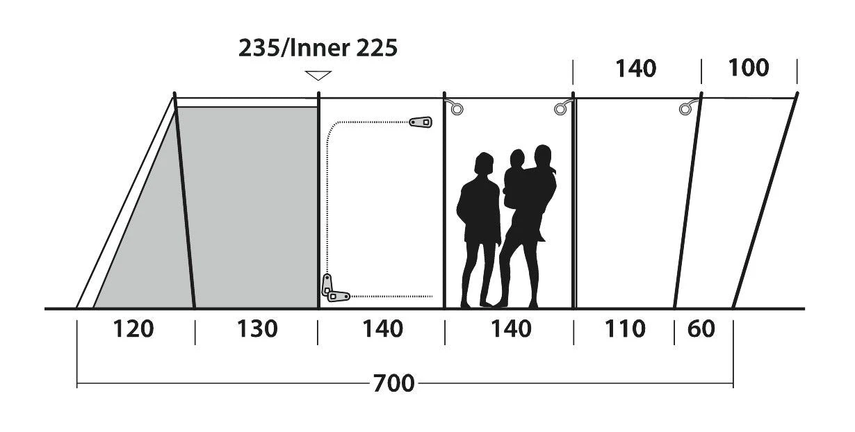 Sleeping seven in three Ambassador Master Bedrooms with Dark Inners and Quick & Quiet Inner Doors, the Vermont 7PE offers spacious, light-filled tent living. Easy opening of the steep front door under the extended front plus twin side D-doors with mesh offers flexible access and extends ventilation options. Pre-bent poles deliver superb stability plus steep walls to maximise internal space and offer full headroom. Home from home comfort and convenience is assured with Quick & Quiet Access to zone 2, the Outwell HookTrack System, Easy Pegging System, Cable Entry, zip-up curtains, Rear Ventilation System and low side vents.